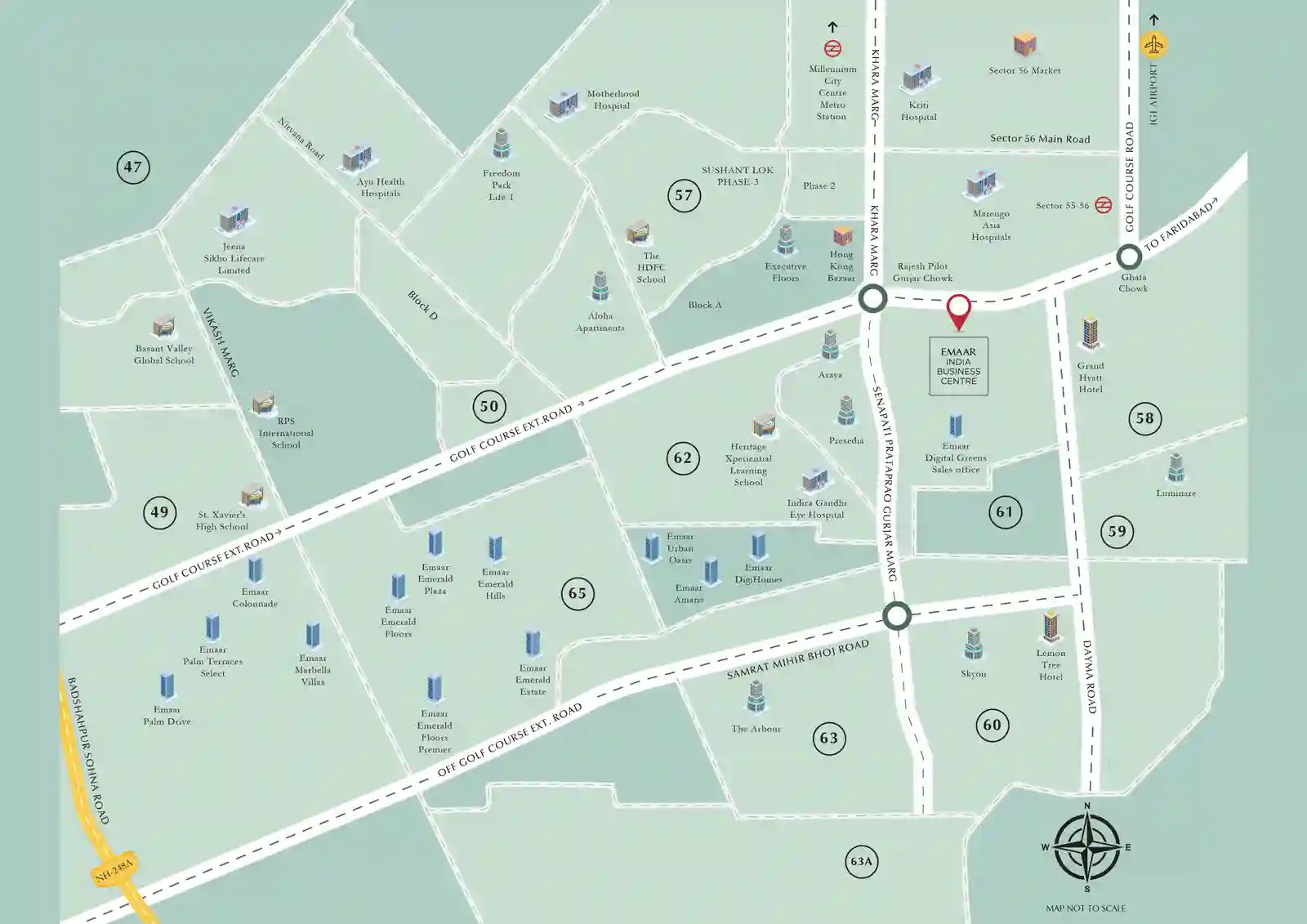 Being a luxury office space in Gurgaon, Emaar India Business Centre is attractive to both international companies and startups as well as professionals. It is situated on Golf Course Extension Road which is a good road with easy access to NH-48, Sohna Road, Cyber City, and Indira Gandhi International Airport thus becoming one of the strategic places that companies look to have connectivity and prestige. The area is highly developed as well with residential houses, schools, hospitals, and shopping centers and establishes a complete ecosystem of business and life.