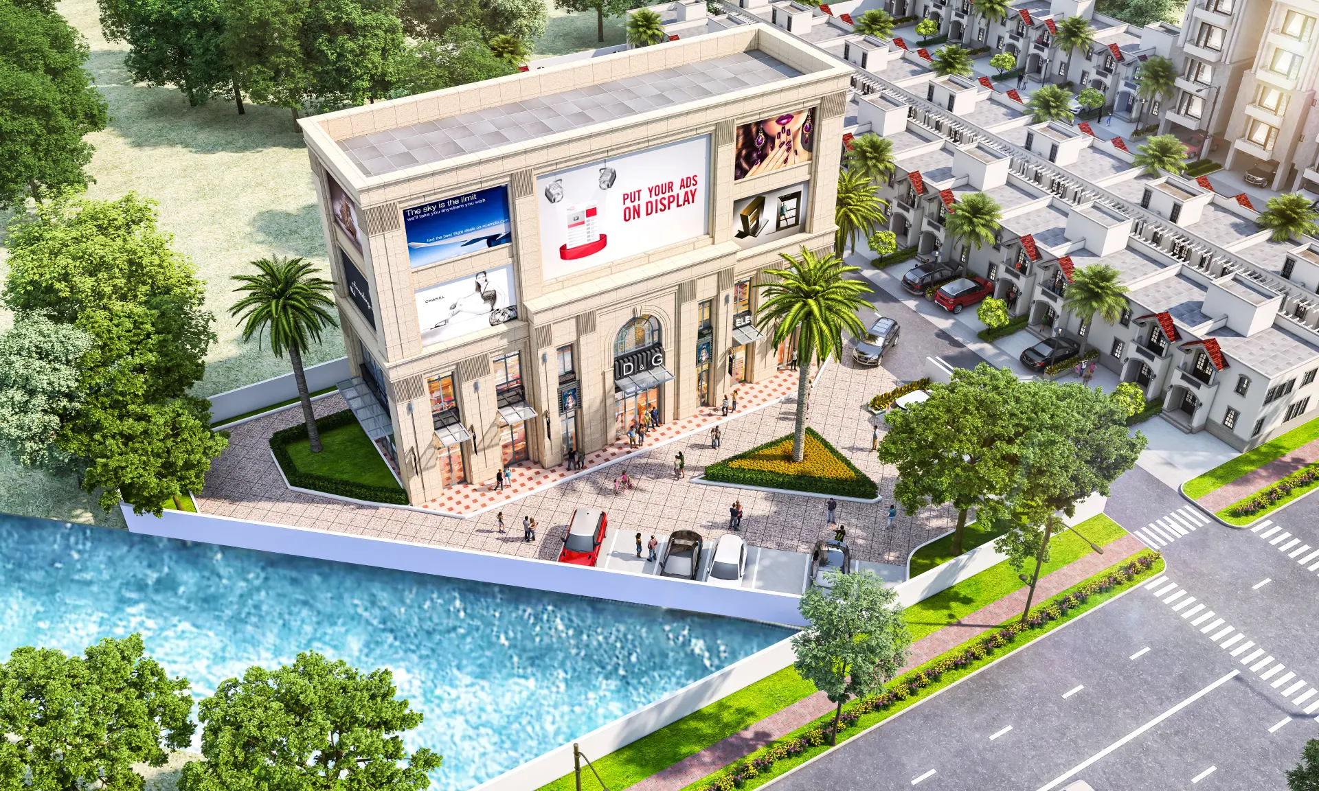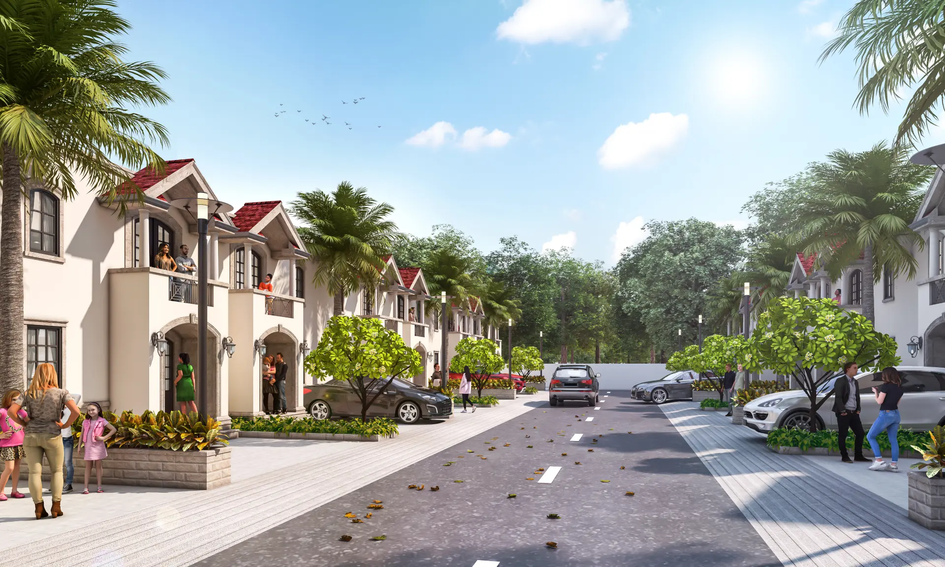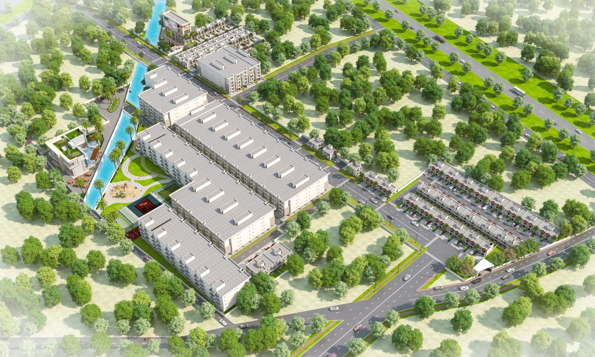 - Beautifully landscaped central park with tree-lined avenues